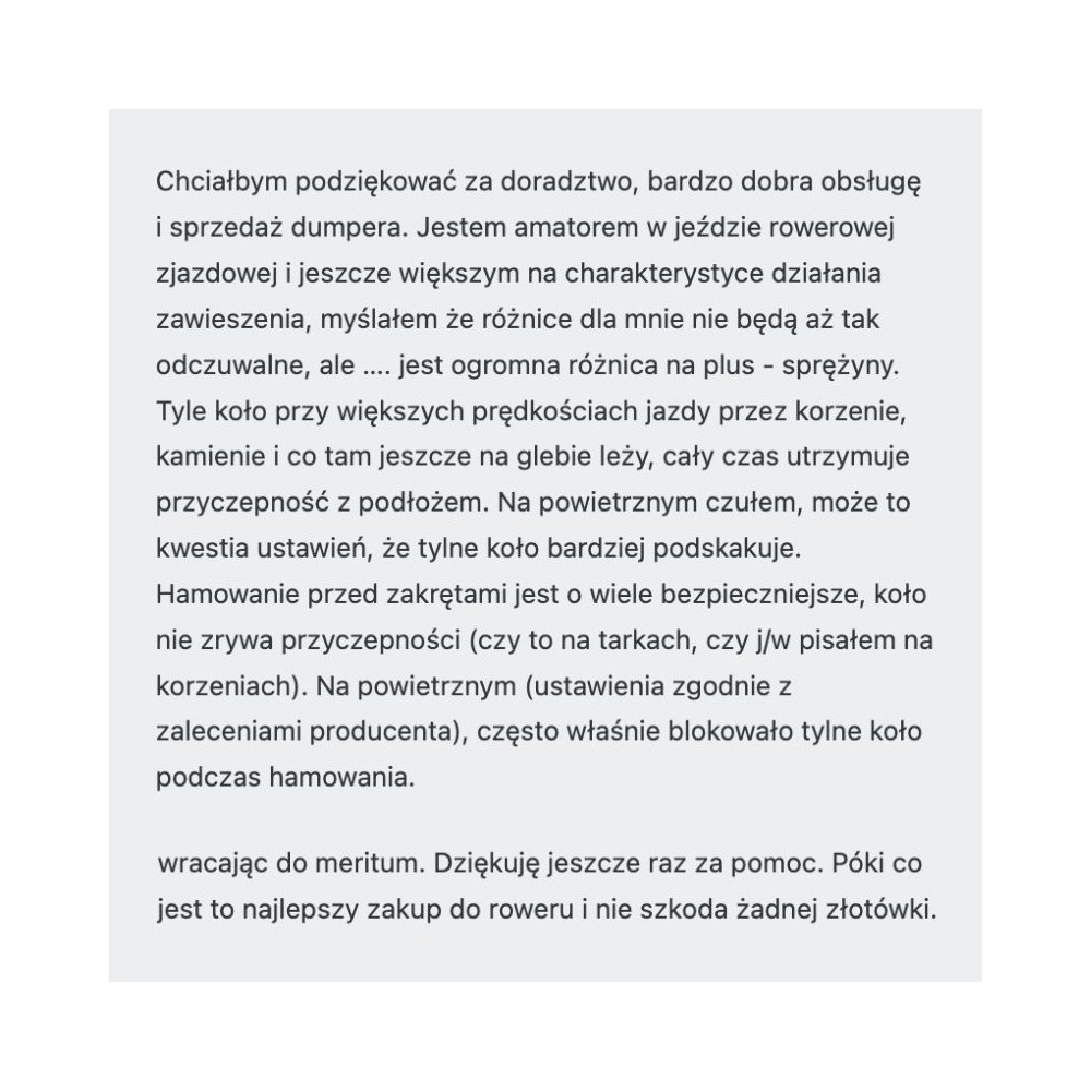 Sprawdź, co mówią riderzy, którzy skorzystali z naszego doradztwa, analizy sprzętu i doboru zawieszenia. To nie są anonimowe recenzje – to realne wiadomości od osób, które potrzebowały konkretnego wsparcia i je otrzymały. U nas nie tylko kupujesz - u nas ustawiasz i rozumiesz swój rower.