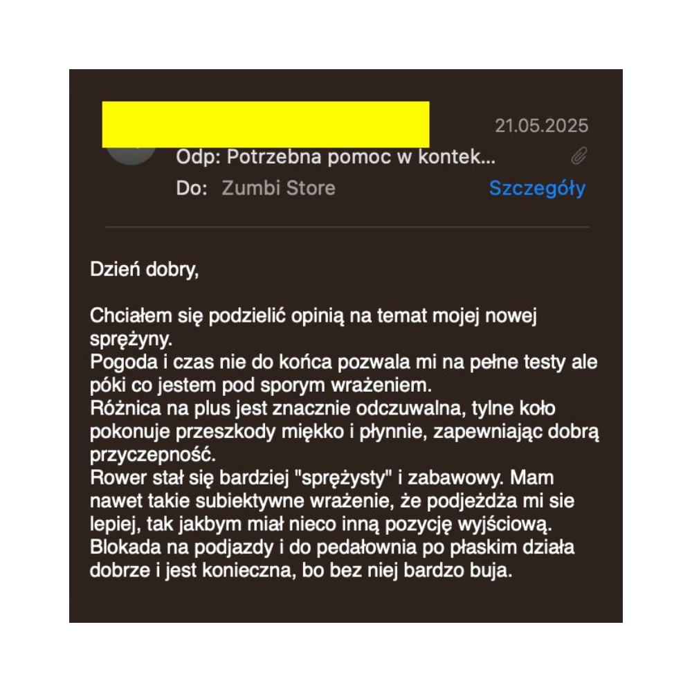 "Chciałem się podzielić opinią na temat mojej nowej sprężyny. Pogoda i czas nie do końca pozwala mi na pełne testy ale póki co jestem pod sporym wrażeniem. Różnica na plus jest znacznie odczuwalna, tylne koło pokonuje przeszkody miękko i płynnie, zapewniając dobrą przyczepność. Rower stał się bardziej "sprężysty" i zabawowy. Mam nawet takie subiektywne wrażenie, że podjeżdża mi sie lepiej, tak jakbym miał nieco inną pozycję wyjściową. Blokada na podjazdy i do pedałowania po płaskim działa dobrze i jest konieczna, bo bez niej bardzo buja."