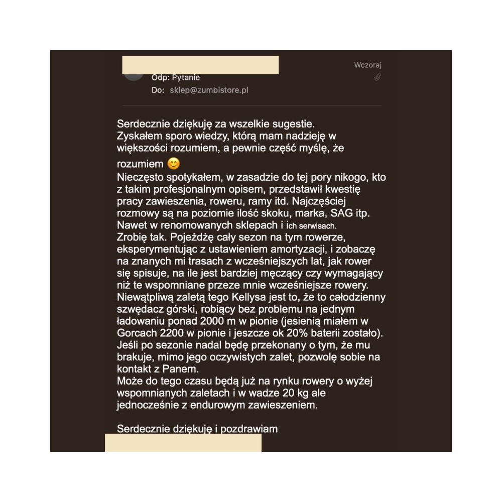 Sprawdź, co mówią riderzy, którzy skorzystali z naszego doradztwa, analizy sprzętu i doboru zawieszenia. To nie są anonimowe recenzje – to realne wiadomości od osób, które potrzebowały konkretnego wsparcia i je otrzymały. U nas nie tylko kupujesz - u nas ustawiasz i rozumiesz swój rower.