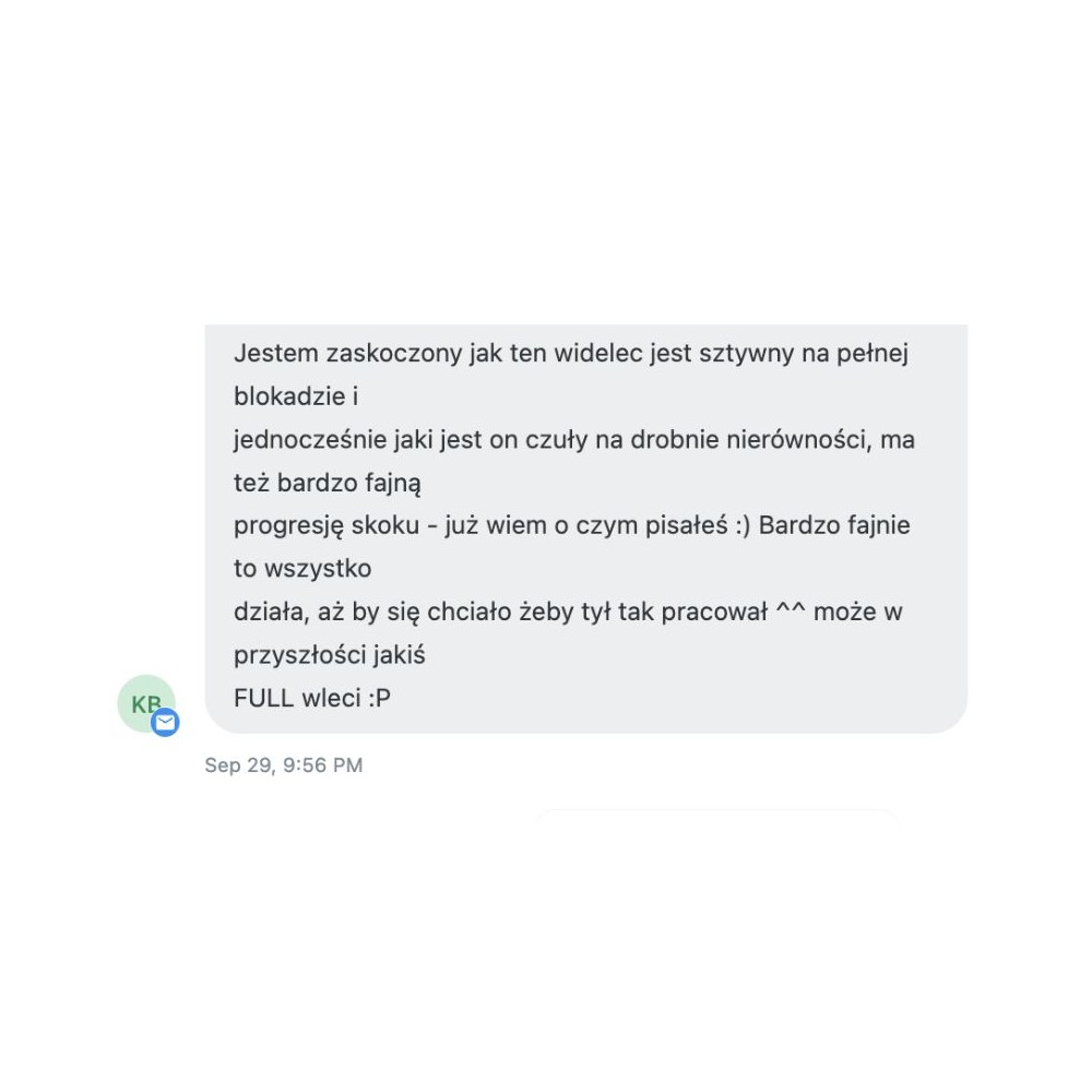 "Jestem zaskoczony jak ten widelec jest sztywny na pełnej blokadzie i jednocześnie jaki jest on czuły na drobnie nierówności, ma też bardzo fajną progresję skoku - już wiem o czym pisałeś :) Bardzo fajnie to wszystko działa, aż by się chciało żeby tył tak pracował - może w przyszłości jakiś FULL wleci :P"