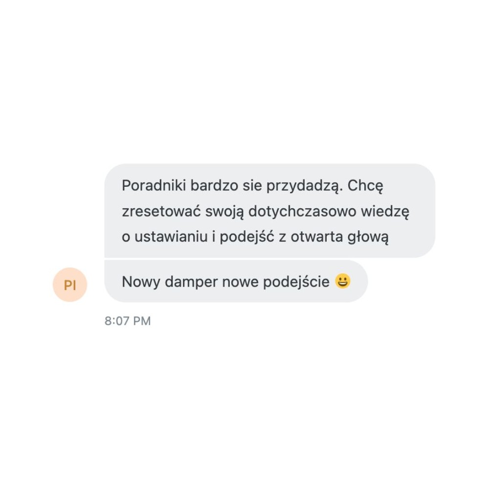 "Poradniki bardzo sie przydadzą. Chcę zresetować swoją dotychczasowo wiedzę o ustawianiu i podejść z otwartą głową. Nowy damper nowe podejście."