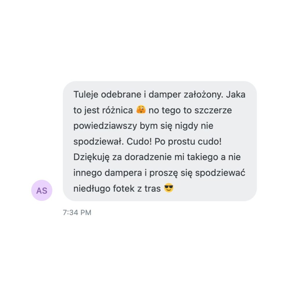 "Tuleje odebrane i damper założony. Jaka to jest różnica no tego to szczerze powiedziawszy bym się nigdy nie spodziewał. Cudo! Po prostu cudo! Dziękuję za doradzenie mi takiego a nie innego dampera i proszę się spodziewać niedługo fotek z tras".